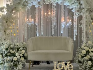 Our décor is sophisticated yet neutral. Our Banquet room walls are a blend of rich cream and white and our Foyer and is a soft neutral gray with white trim framing our rich walnut double staircase creating the perfect backdrop for your photos; a versatile compliment to any theme or inspiration. Our three large ballrooms have 15 foot ceilings which stand impressive on their own yet allow you to plan and add your own extra special décor elements.